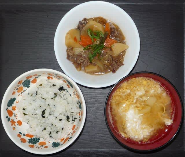 夕食:わかめご飯、肉じゃが、玉ねぎとじゃがいもの味噌汁