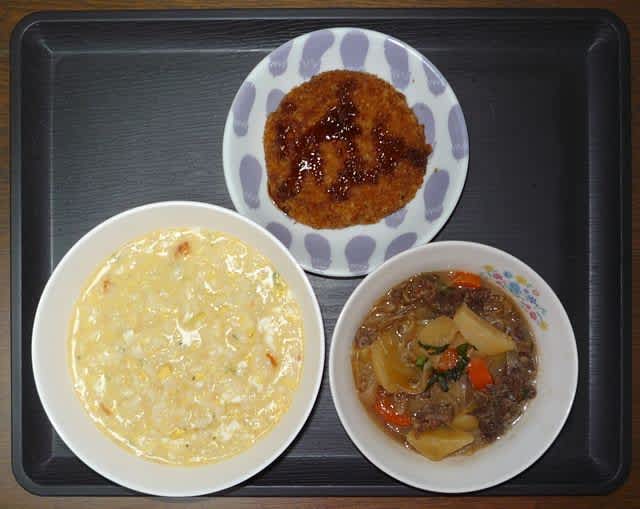 朝食:ちょっと雑炊、肉じゃが、ミンチカツ