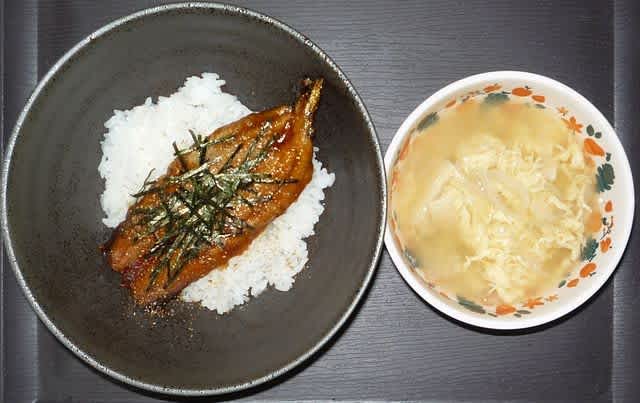 夕食:さんまの蒲焼丼、玉ねぎと油揚げの味噌汁